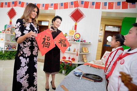 2017年11月9日彭麗媛和梅拉尼婭參觀板廠小學,拿着學生寫的福字