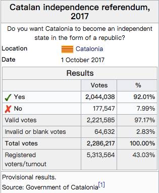 10月21日,西班牙政府宣佈解散加泰羅尼亞自治區議會、自治區政府並罷免其領導人,6個月內選出新自治區議會。10月27日,西班牙參議院表決是否對加泰羅尼亞實行直接管治。在西班牙政府的重重緊逼下,當天,加泰羅尼亞自治區議會終於表決宣佈獨立(在中央政府的步步緊逼下被迫宣佈獨立,慫×4),隨後西班牙參議會決定對加泰羅尼亞進行直接統治。