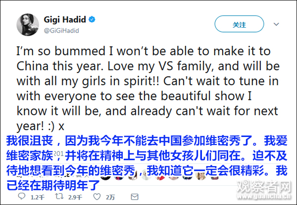 先是超模吉吉·哈迪德(Gigi Hadid)11月17日在推特上確認缺席。