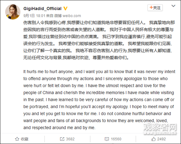 吉吉9月曾在微博上向中國網民道歉。不過,這一道歉聲明並沒有發佈在她的Instagram和推特上。(微博截圖)