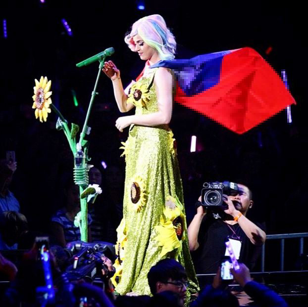 《紐約郵報》“第六頁”報道稱,凱蒂·佩裏2015年在台灣表演時曾上身披“青天白日旗”,下穿“太陽花裙”,引發中國大陸網民的強烈不滿。