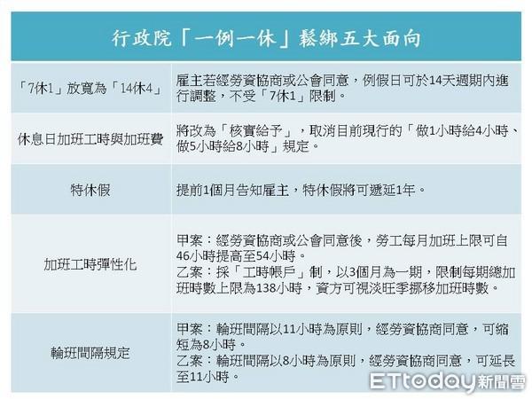 除了鬆綁7休1外,台灣勞動部也打算取消現行加班不足四小時按四小時算、超過五小時按八小時算的加班費規定,改依實際時數計算,還提出遞延特休假、彈性延長加班工時上限、放寬輪班間隔11小時規定等計劃。11月6日由賴清德親自主持行政、立法協調並正式拍板,要趕在年底前完成修法。