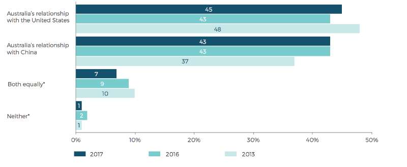 據2017年的最新報告,“中國不是最親密的朋友,但非常重要”。被問及對中或對美的關係哪個更重要時,45%選擇美國,43%選擇中國。45歲以下的人羣中,50%認為中國更重要,40%認為美國更重要。45歲以上人羣中,認為中國更重要的38%。在誰是“最佳好友”之問中,53%選擇新西蘭,17%選擇美國,17%選擇英國,8%選擇中國,2%選擇日本。