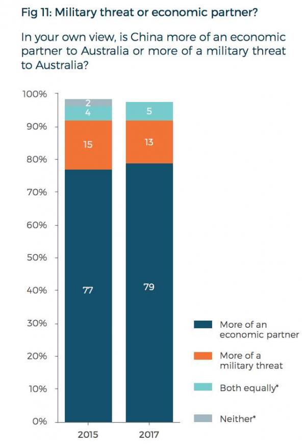 今年的調查中,46%的受訪者認為未來20年內,中國會成為澳大利亞的軍事威脅。被問及中國更是“軍事威脅”還是“經濟夥伴”時,79%認為中國是經濟夥伴,僅有13%認為中國是軍事威脅。報告認為,儘管澳洲對中國的“軍事企圖”有所察覺,出於經濟原因仍不願意和中國直接對峙。如果中國因為島嶼或領土爭端與鄰國開戰,34%支持本國出兵,58%反對。