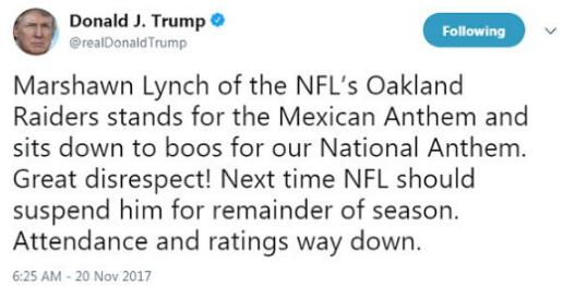 【觀察者網綜合報道】據多家外媒11月20日報道,當天一大早,美國總統特朗普又跟美國職業橄欖球聯賽(NFL)球員懟起來了。原因是在一場19日於墨西哥城舉行的舉行的NFL比賽中又現“國歌抗議”行為。奧克蘭突襲者隊球員馬肖恩·林奇在賽前演奏美國國歌的時候坐在場邊。美國總統特朗普為此凌晨發推,怒懟林奇“應該被禁賽”。