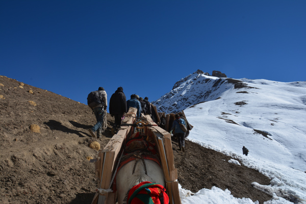 在西藏自治區日喀則市吉隆縣貢當鄉樟村修建基站,晝夜兼程,人背馬馱 圖片來源:新華網