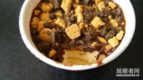 圖片上黃色看起來像是豆腐的塊狀物,其實就是香蕉奶糖了。而黑褐色的“醬汁”,則是曲奇餅。