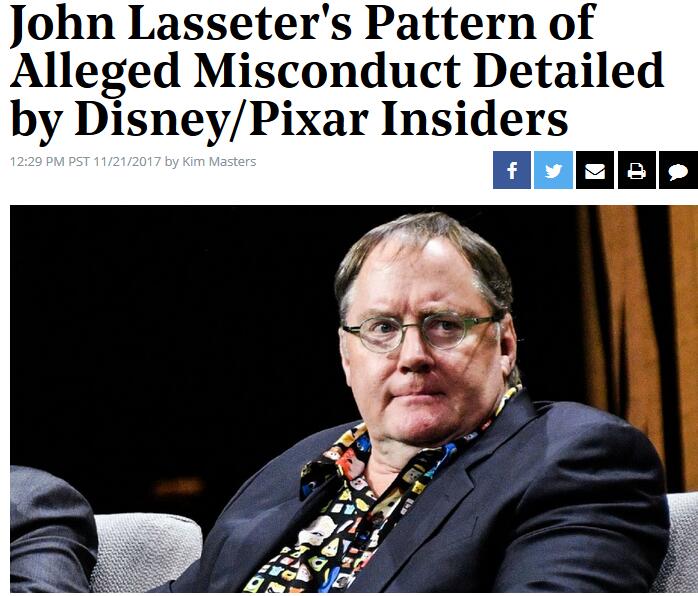 【觀察者網綜合】據美媒當地時間11月21日報道,好萊塢性醜聞不斷髮酵。近日,迪士尼動畫大師、皮克斯聯合創始人,董事兼執行製片人約翰·拉斯特(John Lasseter)因為性騷擾宣佈將休假6個月,暫停迪士尼和皮克斯動畫工作室首席創意官的工作。