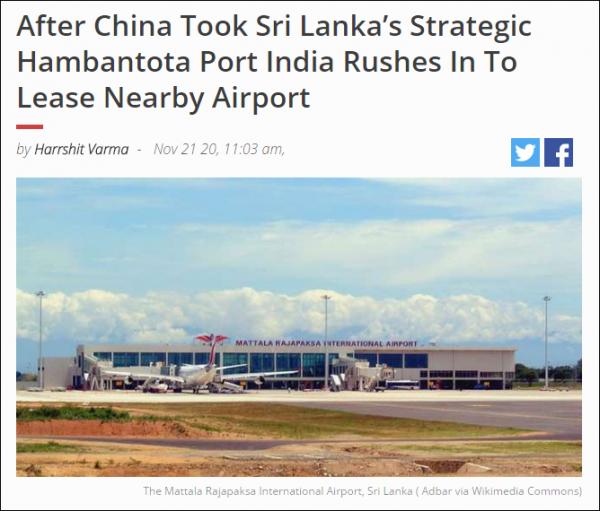 據悉,今年7月底,中企出資11億美元拿下漢班託塔港70%的股權。當時就有外媒報道稱,“印度欲與中國抗衡,打擊中國在南亞地區日益增加的存在感,為此印方向斯里蘭卡喊話,‘忘掉中國吧,我們想要你的空機場’”。