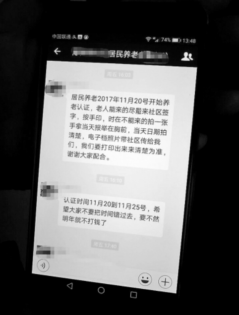 市民收到社區發來的養老保險認證通知的微信