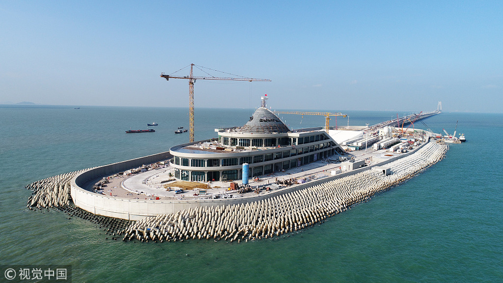 2017年10月18日,廣東珠海,港珠澳大橋西人工島風帽結構順利封頂。(圖源:視覺中國)