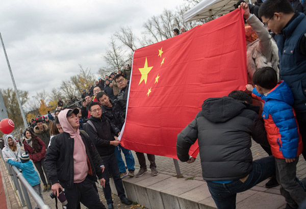 在場中國球迷亮出五星紅旗與“藏獨”旗幟對陣