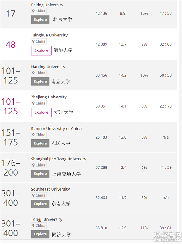 闖入世界大學排名前200的中國大陸高校 排名截圖
