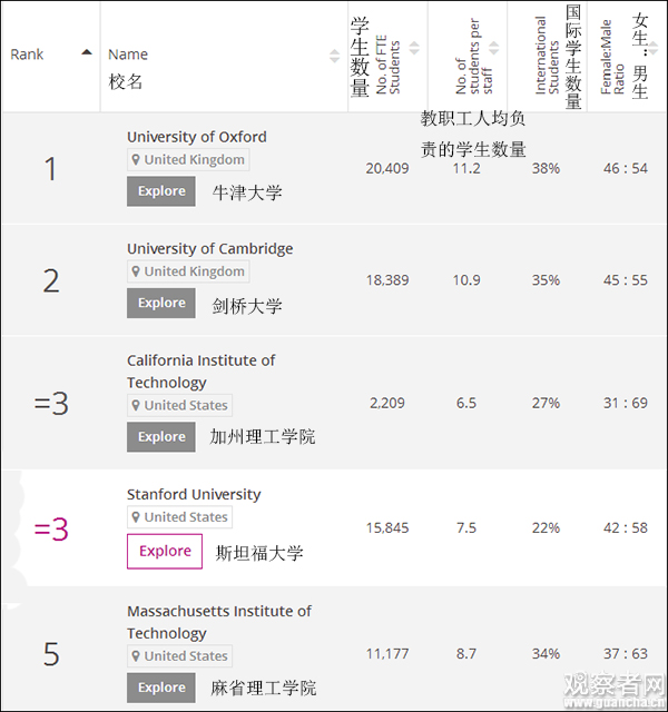 今年9月,《泰晤士高等教育》同樣發佈了第14屆年度世界大學排名,這1000所大學來自 77個國家/地區。以下為榜單前5名。