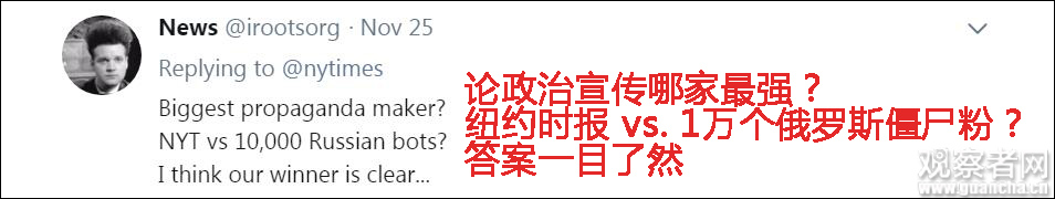 可是,更多的讀者表示“這就是一場政治宣稱”,稱俄羅斯RT電視台的文章,在這篇“軟文”前都得甘拜下風。**其中不乏有各路媒體大腕,**紛紛批評這位新聞行業內德高望重的記者有失水準的表現。