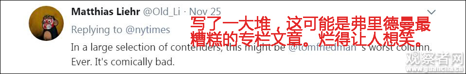 也有人直言,稱這是這位新聞大師最糟糕的專欄文章。美國女性期刊雜誌《瓊斯媽媽》專欄作者Shane Bauer直接批評道弗裏德曼犯了“記者不該犯的錯誤”。