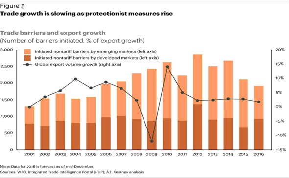 圖中的折線表示世界貿易增長百分比,在2007年之前世界貿易的增長幅度較大,歷年均在5%左右。到了2008年、2009年增長幅度依次下滑,2010年有一個反彈,接下來便又是逐漸下滑,增長幅度趨近於0。據荷蘭經濟政策研究局統計,2011年到2016年全球貿易增長速度一直低於全球經濟增長速度,這在過去是十分罕見的現象,因為以往都是貿易增長速度大於經濟增長速度,國家與國家間經濟相互依存的程度越來越高,經濟越來越開放。