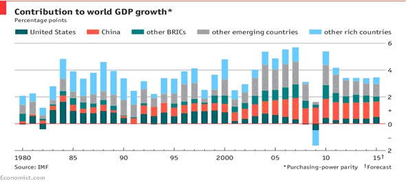 我們再來看全世界經濟增長的動力來源。這幾年世界經濟一直在減速,尤其是從2008年、2009年以後,但是還是維持在了3.6%到3.7%增長率。
