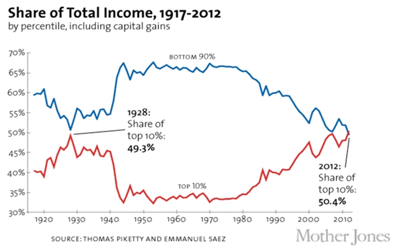 這幅圖就解釋了為什麼會出現特朗普現象。這幅圖從一戰以後一直統計到2010年,將近一百年的時間。紅線代表前10%的最高所得層的薪資和資本收入佔總收入的比重,藍線代表剩下的90%所佔比重。在經濟大恐慌前夕出現了急劇的經濟兩極化,10%的人囊颳了將近一半的總收入,這是醖釀經濟危機的一個基本條件,因為中產階級和勞工失去了消費能力,就會導致總體需求不足。