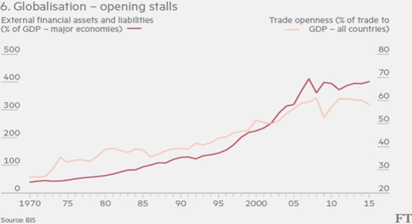 我們看這張圖,淺紅色的折線表示的是貿易依存度。從上個世紀70年代開始,貿易依存度一直處於上升趨勢,全世界貿易依存度從最初的30%一直上升到近60%,而像新加坡這樣的國家甚至超過了100%。但是從2009年之後,貿易依存度開始持平甚至下滑。深紅色的折線表示國家的境外資產和負債總額在GDP中所佔的比重,也就是國家之間在資金、金融方面的相互依存關係。過去這個比重一直在不斷上升,而現在卻失去了上升動力。這兩條折線都充分顯示了經濟全球化的腳步在放緩,甚至在倒退。