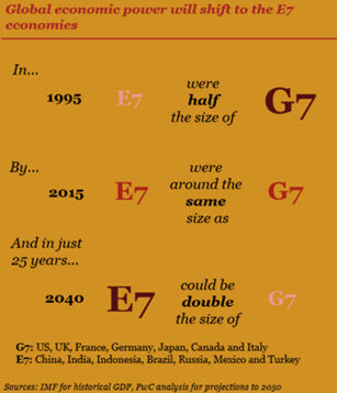 下面這張圖表是Price Waterhouse Coopers(全世界最大的會計公司)旗下智庫製作的一個報告,這個報告預測未來全世界經濟的主角將不再是傳統的G7而是E7,就是七大新興市場國家,E7即中國大陸、印度、俄羅斯、印度尼西亞、土耳其、墨西哥、巴西。