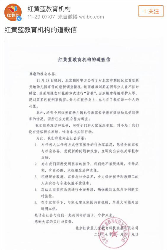 29日早,據人民日報微博消息,紅黃藍教育機構發佈道歉信,稱倍感難過和恥辱,向孩子們和大家深深道歉。將對幼兒園監控系統進行全面升級。