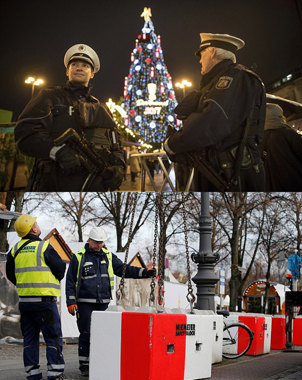 德國警方在聖誕樹前警戒,並設置路障