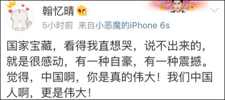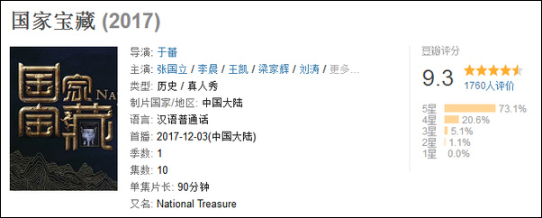 《國家寶藏》的總導演於蕾此前曾説,希望觀眾看完節目會有一種油然而生的自豪感,這才是真正的文化自信,真正的弘揚優秀傳統。“每一件文物真正的價值,不是它值多少錢,而是它背後的人文精神、民族性格以及它所代表的我們整個民族的歷史進程。”