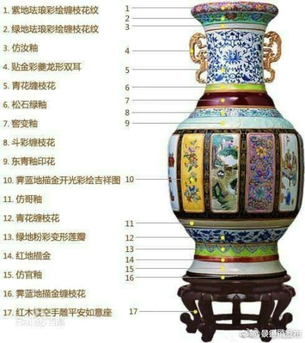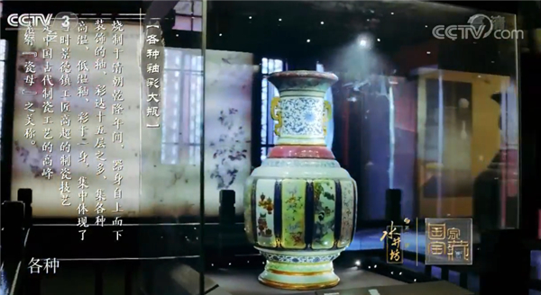 這個瓷器的全稱叫“各種釉彩大瓶”,器身自上而下裝飾的釉、彩達15層之多,集結了從宋代到清代的17種最具代表性的釉彩。