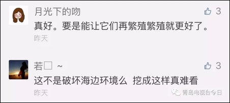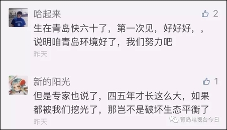 一件小事引起了這麼大的關注,是我們在播出這條新聞之前始料不及的,這説明市民們的生態環保意識越來越強,大家不願意看到我們身邊的環境受到一絲一毫的損害。從前幾年銷聲匿跡,到這幾年“重現江湖”,“海知了”的迴歸是大自然的饋贈,也是對島城海洋資源修復工作的充分肯定。
