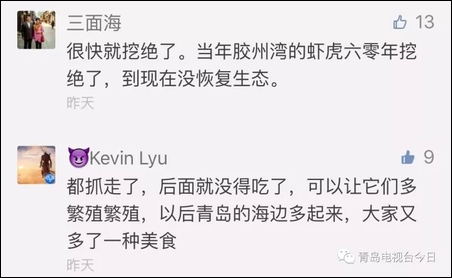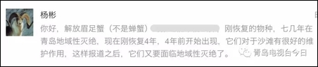 “解放眉足蟹,不是蟬蝦。是剛恢復的物種,七幾年在青島地域性滅絕,現在剛恢復四年,四年前開始出現,它們對於沙灘有很好的維護作用,這樣報道之後,它們又要面臨地域性滅絕了。”——網友
