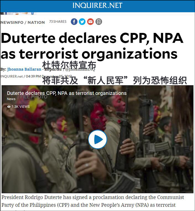 菲律賓總統杜特爾特簽署公告:將菲共及其武裝列為恐怖組織