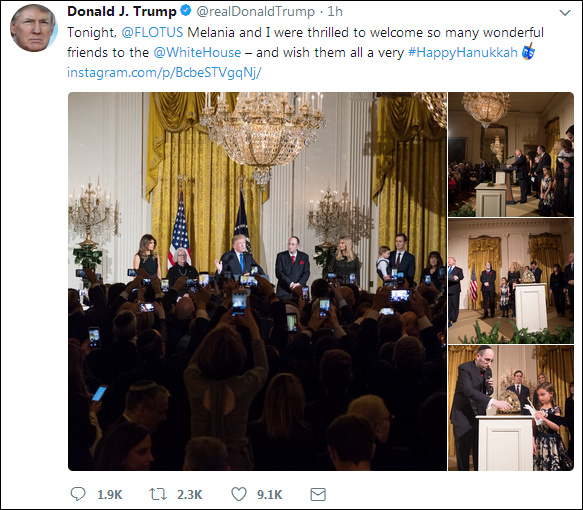 他也在推特上發文説:“今晚,我和梅拉尼婭很高興歡迎那麼多的朋友來白宮。希望大家光明節快樂。”