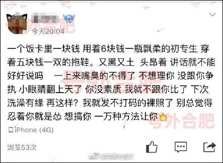 另一張截圖顯示,約9分鐘後,上述女生又發佈了一條信息,攻擊被髮裸照女生“又黑又土”“嘴臭”“小眼睛”等,並稱,“你沒素質,我就不跟你比了,下次洗澡有緣,再這樣,我就發不打碼的裸照了,別總覺得忍着你就是慫,想搞你一萬種辦法讓你(火)”。