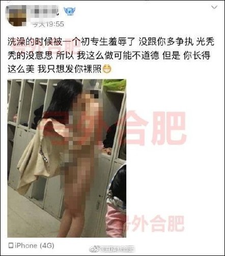微博網友@直播新合肥 12月7日發帖稱,因在澡堂發生爭執,出於報復,合肥幼兒師範高等專科學校一名女生把其他女生裸照發至QQ空間。
