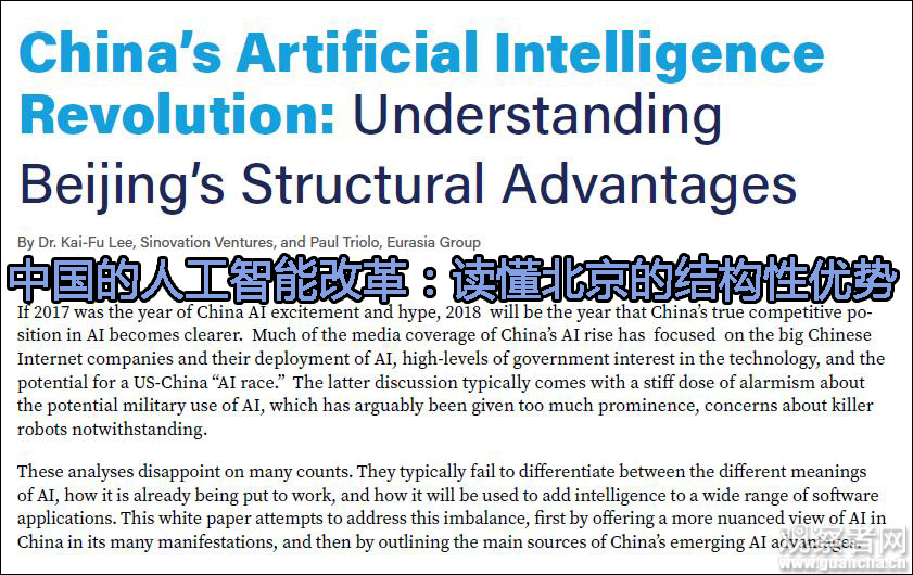 12月6日,全球最大政治風險諮詢公司亞歐集團(Eurasia Group)聯合李開復,發表了有關中國人工智能領域的白皮書,指出了中國在發展這一領域的巨大潛能。文中開篇就寫道,如果2017年中國AI產業只是“預熱和炒作”,那2018年北京在AI領域的優勢才將真正體現。