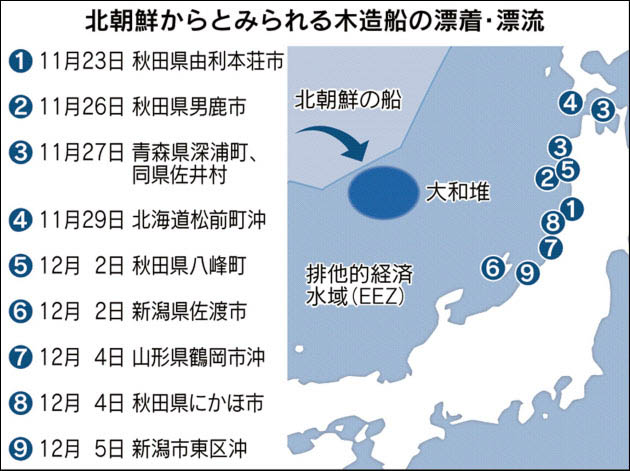 據紐約時報不完全統計,自年初以來,飄流到日本海岸的漁船共有76艘,其中,僅11月一個月裏,就有28艘;在過去的兩週裏,就有將近10艘。所有的船隻都有來自朝鮮的跡象。