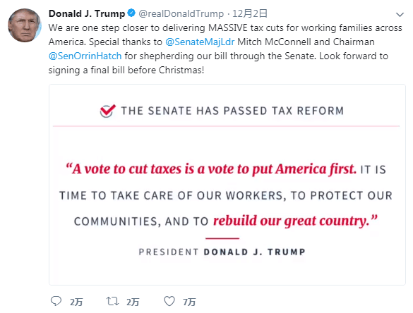 經過馬拉松式的會議,12月2日凌晨1點50分,共和黨在黨性保證下,無論議員們2小時內是否已看完479頁的草案,參議院還是以51:49票的結果單方面強行通過了參議院版本的減税與就業法案。減税,這個特朗普總統競選期間最重要的政綱兑現已露出了曙光,特朗普發推特稱要將其作為美國人民的聖誕禮物。