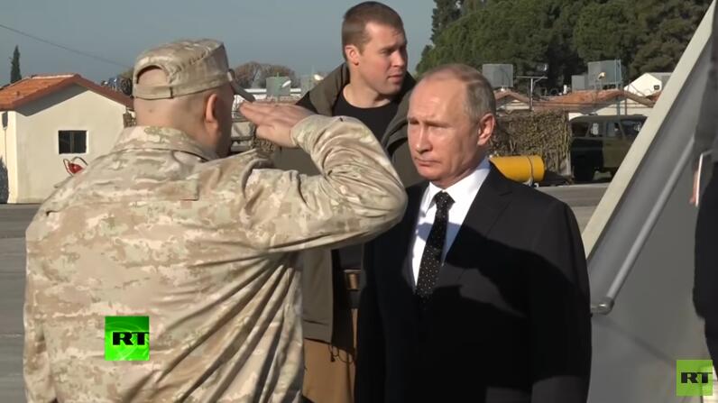 早前媒體報道,普京週一上午抵達赫梅米姆空軍基地。敍利亞總統、俄國防部長和俄駐敍部隊司令在赫梅米姆空軍基地迎接普京。俄羅斯總統乘瓦茲牌軍用車抵達敍利亞赫梅米姆空軍基地人員列隊地點。