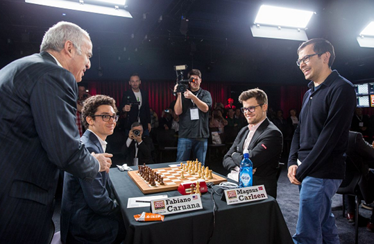 上圖對弈者為國際象棋排名前兩位的卡爾森與卡魯亞納,圍觀者左為卡斯帕羅夫,右為哈薩比斯。哈薩比斯本人是國際象棋職業選手,青少年時排名僅次於天才少女小波爾加,他的“一個框架解決一切棋類問題”的思想這次實現了。