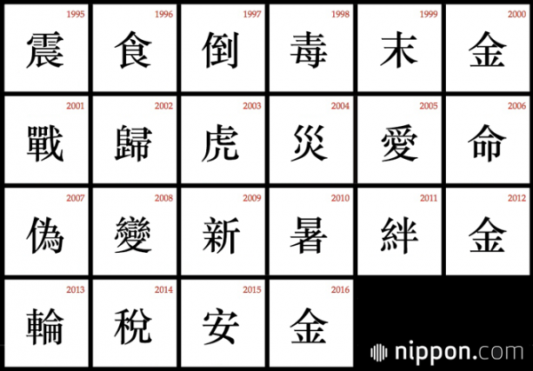 從1995年至今,日本漢字能力檢定協會每年都會票選出一個漢字作為年度漢字,以此來代表一整年的社會風貌。比如,1995年日本發生了里氏7級的阪神大地震,造成6434人不幸遇難,而這年的日本年度漢字就是“震”字;2001年,美國遭遇了最為嚴重的恐怖襲擊,系1941年日軍偷襲珍珠港以來第二次本土遇襲,而這一年日本的年度漢字則是“戰”;2015年,安倍政權無視民意強行通過“安保關聯法案”,造成日本民眾的廣泛不安,所以前年的年度漢字就是“安”。