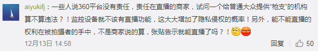 觀察者網此前報道,事情源於12月12日,有自媒體爆料稱360智能攝像頭侵犯用户隱私,在水滴直播上可以看到餐廳、網吧等公眾場合的實時監控視頻。