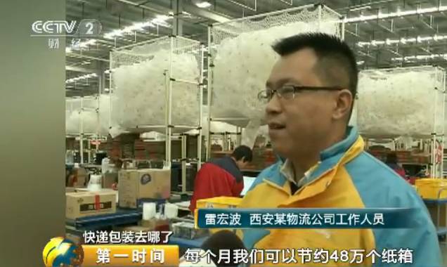 西安某物流公司工作人員 雷宏波:每個月我們可以節約48萬個紙箱,按照一個紙箱按照0.1公斤算的話,我們每個月可以節約48噸的紙箱垃圾。