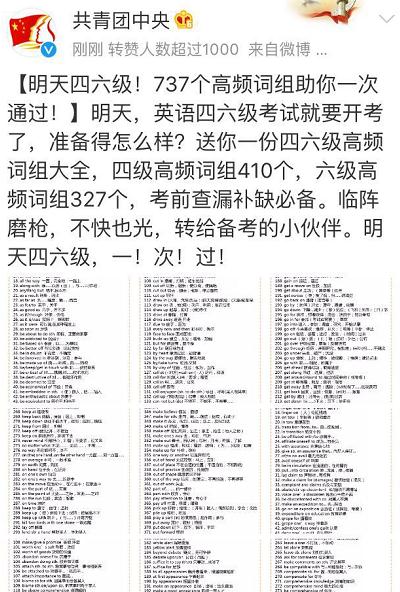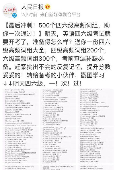 明天又到了四六級考試的日子!各個大V在最後一天也紛紛轉發高頻詞大全,幫助考生查漏補缺!