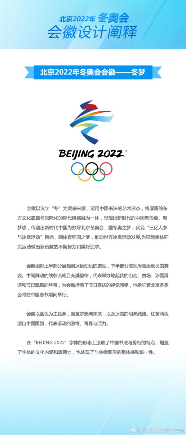 會徽以漢字“冬”為靈感來源,上半部分展現滑冰運動員的造型,下半部分表現滑雪運動員的英姿。中間舞動的線條流暢且充滿韻律,代表舉辦地起伏的山巒、賽場、冰雪滑道和節日飄舞的絲帶,為會徽增添了節日喜慶的視覺感受,也象徵着北京冬奧會將在中國春節期間舉行。