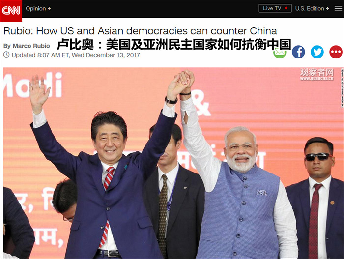 盧比奧同日(13日)還在美國有線電視新聞網(CNN)發文,大談為了對抗中國“長臂”,美國當下就應“強化和印太地區的盟友關係,尤其是和日本、印度、以及澳大利亞等‘民主自由’國家之間在政治、軍事、外交領域的多項合作”,以“確保印太地區的未來朝自由開放前進”。