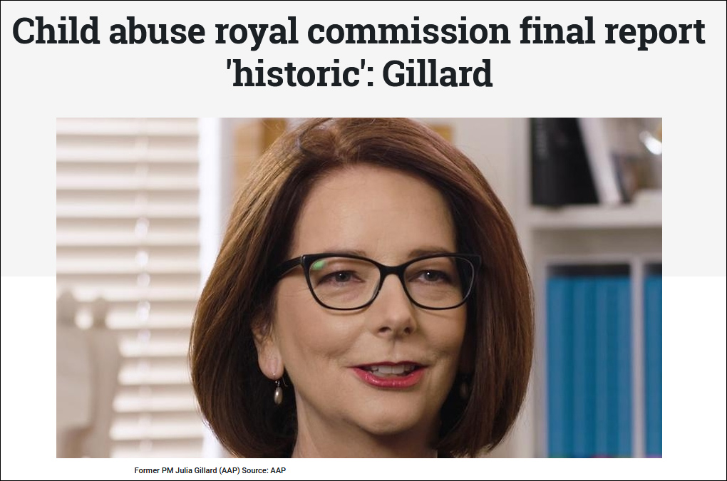 曾在5年前設立皇家委員會調查的澳大利亞時任總理吉拉德(Julia Gillard)對委員會成員及經歷過不幸的人表達了感謝,稱他們為正義和兒童的未來進行了艱苦的戰鬥。