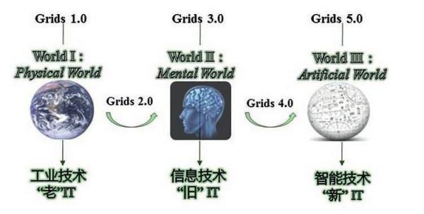 如圖1和圖2所示,這五張網把三個世界緊密地整合為一個整體,其中交通、信息、智聯分別是物理、心理、人工世界自己的主網,而能源網和物聯網分別是第一和第二世界、第二和第三世界之間的過渡和轉換。人類通過Grids2.0從物理世界獲得動力和能源,藉助Grids 4.0從人工世界吸收知識和智源。這五張網,就構成了人類智慧社會完整的基礎設施和平台系統。