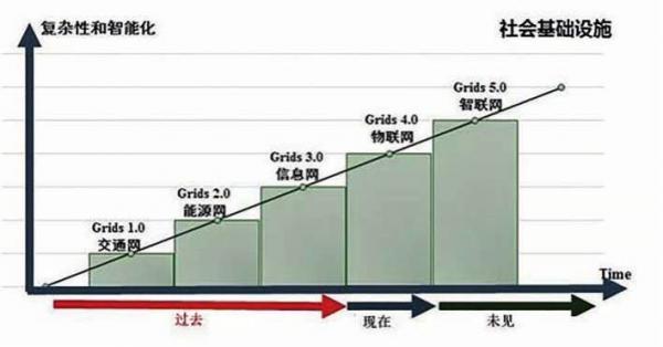 在技術層面,人類社會的歷史,幾乎就是社會基礎設施建設的歷史。具體而言,就是圍繞着物理、心理和人工三個世界建“網”。第一張網叫Grids1.0,主體就是交通網;第二張是Grids 2.0,就是以電力為主的能源網;第三張Grids 3.0,就是以互聯網為主的信息網;第四張Grids 4.0,就是正在建設之中的物聯網;而接下來必須開建的第五張網Grids5.0,就是使我們進入智慧社會的智聯網。