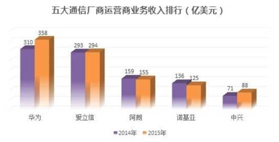 大家都知道華為和中興是世界級通信設備廠家,但是對具體強到什麼地步可能沒有具體概念,下圖是2015年全球五大通信設備廠家來自運營商的收入,呈現兩大三小的趨勢,華為和愛立信是兩強,分別為358億美元和294億美元。